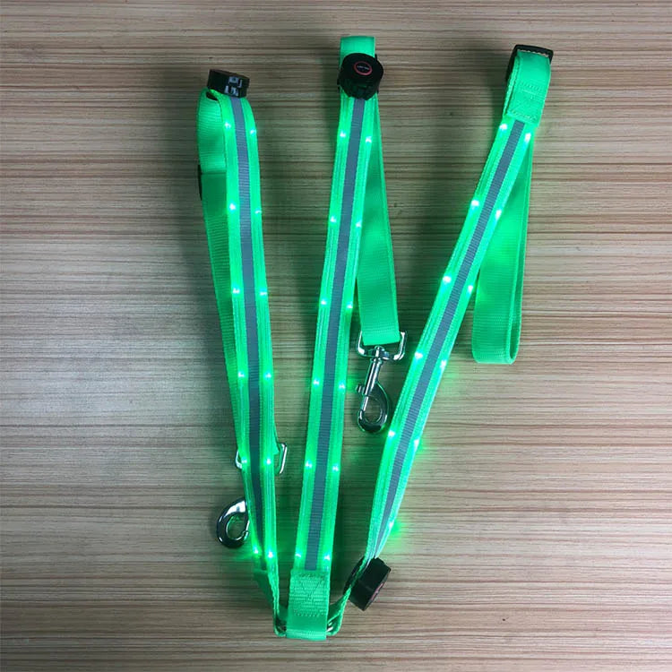 The outer seams on the colored nylon straps (not the black ones) are stitched with reflective thread, making the breast collar reflective and highly visible in the dark even when the LED light is turned off.